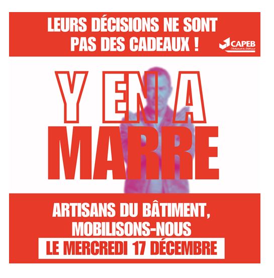 Le 17 décembre, la CAPEB Bas-Rhin appelle les artisans du bâtiment à se mobiliser devant la Préfecture de Strasbourg pour faire part de leur mécontentement, nous nous associons à ce mouvement.